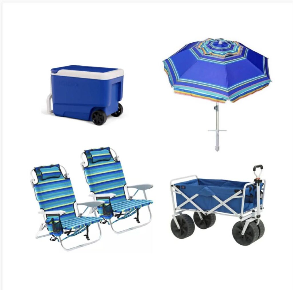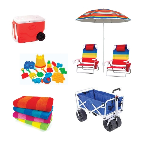 Beach chairs, beach umbrellas, beach wagons, rolling coolers, beach tents, sand toys, beach towels and more.