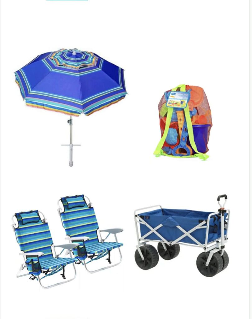 2 beach chairs + umbrella + beach wagon + rolling cooler + 4 beach towels + a bag of sand toys